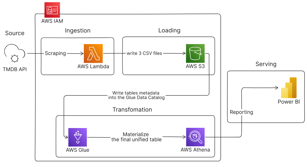 AWS Athena: Create unified queryable table combining all three data sources. SQL queries enable complex analytics on box office trends, genre performance, and language distribution.