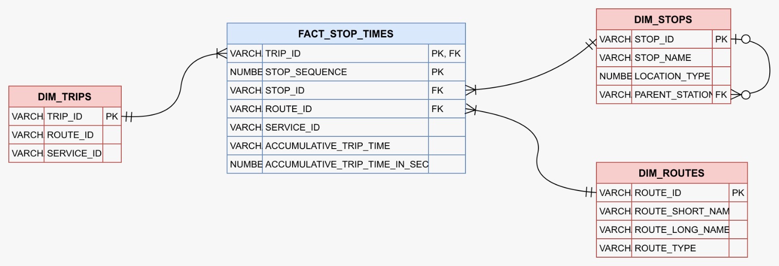 Transformation: Remove unnecessary tables and design star schema with FACT_STOP_TIMES as the central fact table.