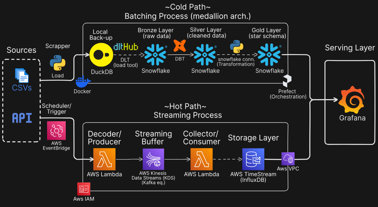 Dual storage: AWS Timestream for real-time monitoring, Snowflake for historical analysis